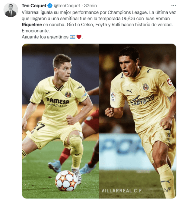 Con el triunfo ante el Bayern, Villarreal alcanzó las semifinales de la Champions League por segunda vez en su historia. El primer hito tuvo lugar en la temporada 2005/06, bajo el mando del chilenoManuel Pellegrini y con Riquelme como la figura estelar del equipo, siendo el máximo goleador en todas las competencias con 12 tantos en total.