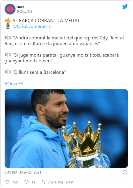 De todas formas, el corresponsal aseguró que el contrato del atacante argentino incluirá premios por objetivos. Esto último significa que según distintos logros que logre el Kun en Cataluña (partidos, goles y/o títulos), será mayor el dinero que ganará cada temporada.