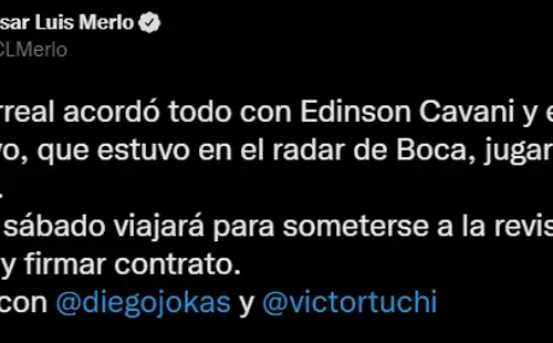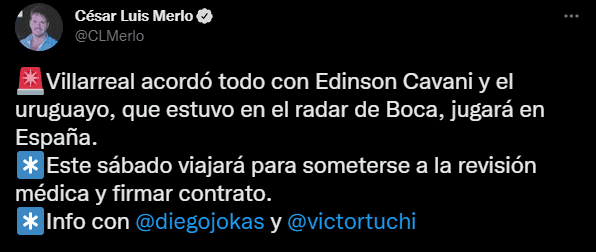 Y solodías después de la declaración del Vicepresidente de Boca sobre su caso, el futuro de Cavani se definió del todo, siendo su destino el mismo club que Román mencionó y que también es un equipo en donde él es ídolo. Así lo sostuvo el periodista César Merlo, quien confirmó que “Villarreal acordó todo con Edinson Cavani y el uruguayo, que estuvo en el radar de Boca, jugará en España“.