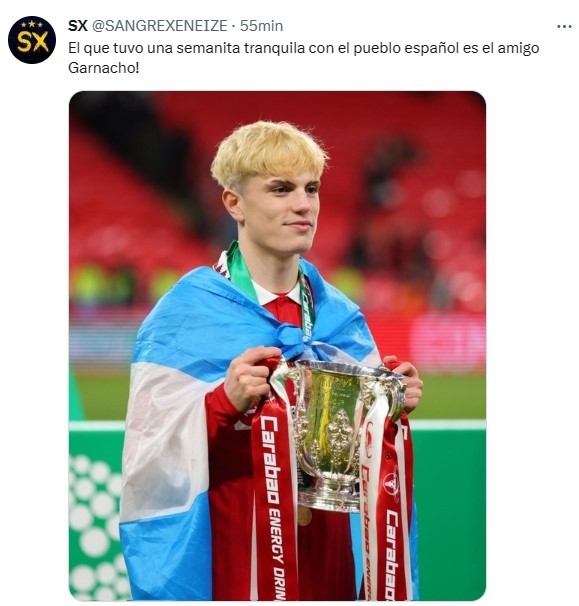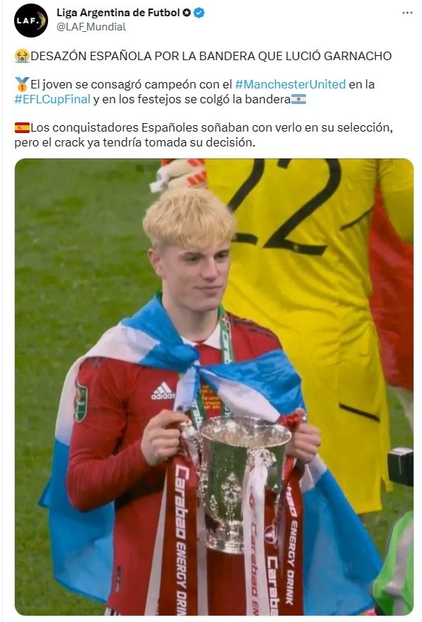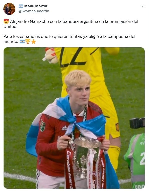Es que, tras campeonar con el Manchester United -su primer título en el club-, Garnacho volvió a sacar su argentinismo del corazón y festejó junto a sus compañeros con una bandera de Argentina en su espalda, otro gesto positivo pensando en futuras convocatorias bajo el mando de Lionel Scaloni.