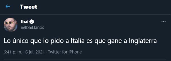 Allí fue cuando Ibai Llanos utilizó su cuenta oficial de Twitter para publicar un mensaje ni bien terminó el partido. Y, en el mismo, expresó su deseo de cara a la resolución del trascendental certamen continental:“Lo único que le pido a Italia es que le gane a Inglaterra”, manifestó, dejando bien claras su inclinaciones para la gran final.