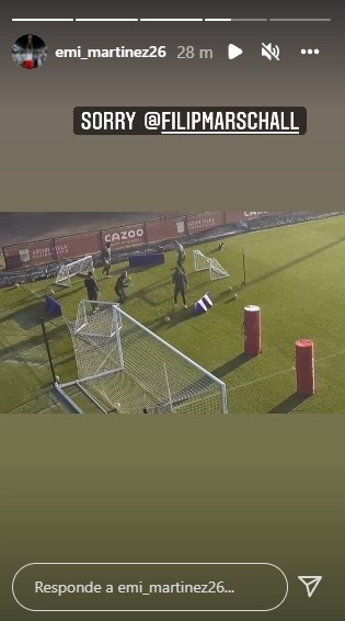 Emiliano compartió el video a través de sus historias de Instagram y le pidió “Perdón” a su compañero. El lujito del “Dibu” se hizo viral en las redes: ¿se animará a tirarlo en un entrenamiento de la Albiceleste?