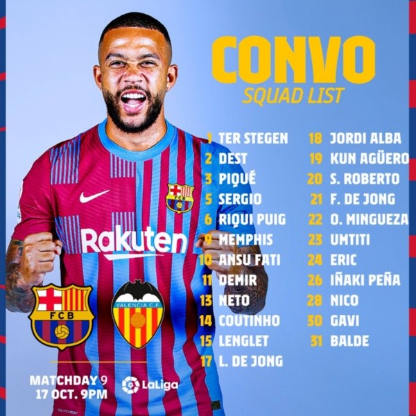 Este domingo a las 16 (hora argentina), Barcelona recibirá al Valencia por la novena fecha de La Liga de España. Y tiene una novedad importante de cara al partido: por primera vez Sergio Agüero aparece entre los convocados.