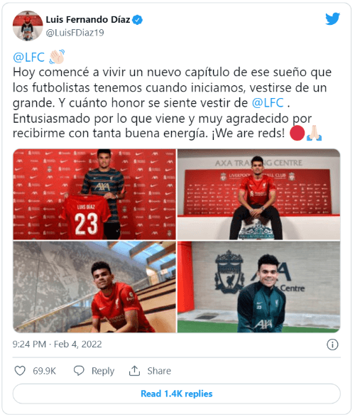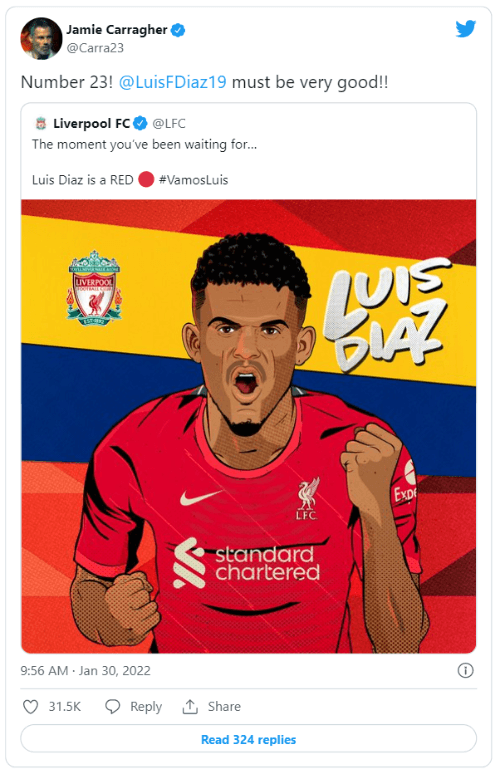 Cuando un hincha del Liverpool piensa en este dorsal solo se le puede venir a la cabeza la cara de Jamie Carragher, leyenda de la institución que alcanzó la gloria con los Reds. Tras enterarse de que Díaz heredará la 23, el exdefensor reaccionó positivamente en Twitter: “¡Número 23! Luis Díaz debe ser bastante bueno”.