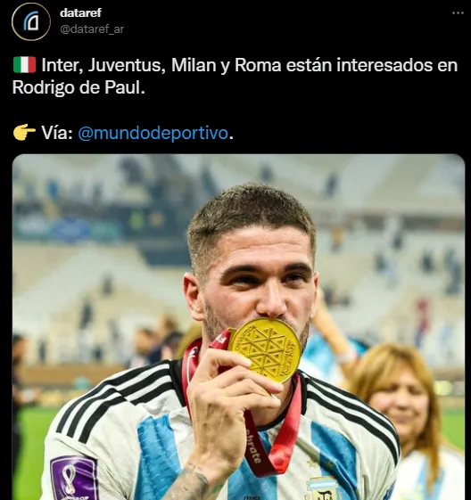 De hecho, en las últimas semanas previas a la Copa del Mundo, desde medios del país ibérico informaron que Atlético Madrid había decidido vender a De Paul este mercado de pases. Y tras la Copa del Mundo con la tercera estrella bordada encima del escudo argentino, no tardaron en llegar pretendientes por su pase desde Italia, en donde supo tener un gran nivel vistiendo los colores del Udinese.