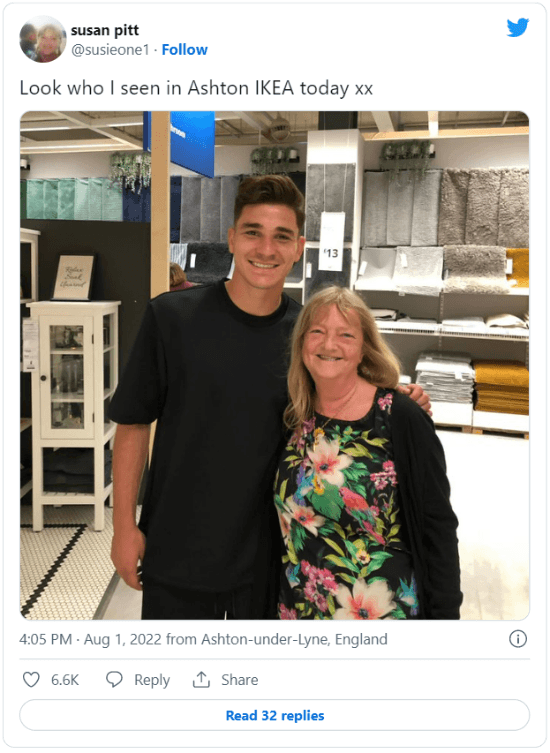 “Miren a quién vi en el Ashton IKEA hoy”, escribió una señora fanática del conjunto dirigido por Pep Guardiola. Con la mejor onda, Julián accedió a tomarse una foto con ella, que aprovechó para subirla a su cuenta de Twitter. Poco importó que solo tenga 44 seguidores, ¡se hizo viral igual!
