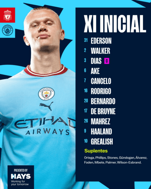 Manchester City: Ederson, Walker, Dias, Ake, Cancelo, Rodrigo, Bernardo, De Bruyne, Mahrez, Haaland, Grealish.