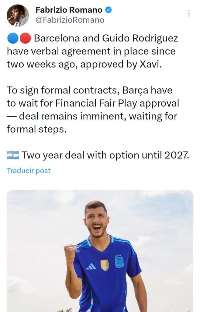 Más allá de ese condicionante que podría retrasar la operación, Romano aseguró que el sigue siendo inminente y que una vez se completen uno a uno los pasos formales que todavía están pendientes, Guido Rodríguez se convertirá en refuerzo para Xavi Hernández.