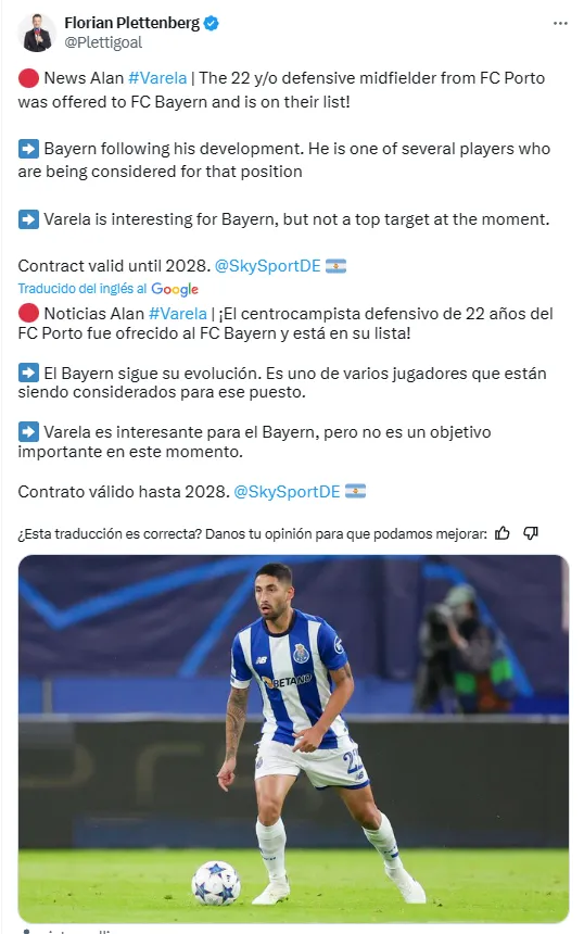 “El Bayern está siguiendo su evolución junto a otros jugadores considerados para ese puesto. Varela es interesante para el club, pero no es un objetivo prioritario en este momento”, describió el reconocido periodista Florian Plettenberg a través de sus redes sociales.