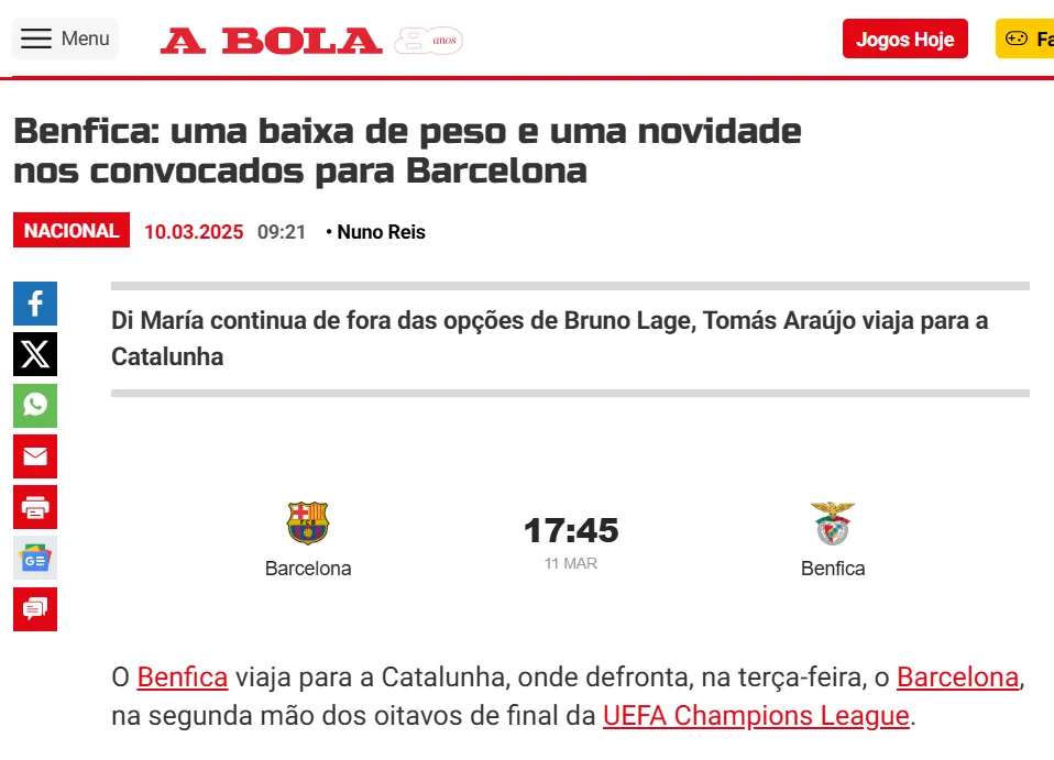 El periódico A Bola apunta que el Benfica sufrirá ”una baja de peso” con la ausencia de Ángel Di María en la delegación que este lunes emprendió camino hacia Cataluña. Remarca que, una vez más, el rosarino no podrá estar a disposición del entrenador Bruno Lange, en este caso, para el trascendental juego contra el elenco de Hansi Flick.