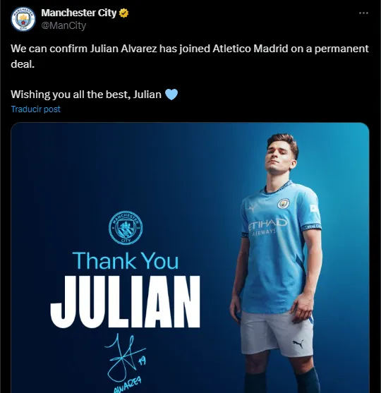 En paralelo, desde Manchester City también reaccionaron de manera virtual a su salida rumbo al Atleti. Primeramente, con un sobrio posteo de despedida, en el que daban por hecho el traspaso: “Podemos confirmar que Julián Álvarez se ha convertido en nuevo jugador del Atlético de Madrid. ¡Mucha suerte, Juli!”. Luego, publicaron un emotivo video en el que aparecen sus momentos más destacados en el club inglés, junto con algunos momentos de toda su carrera en general.