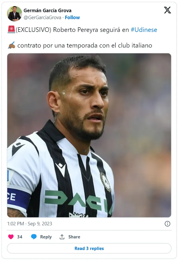 Según informó el periodista Germán García Grova, Tucu Pereyra arregló un nuevo contrato con el Udinese y firmará por un año más. El mediocampista había finalizado su vínculo el pasado 30 de junio y ahora llegó a un acuerdo para regresar. Deseo cumplido para él, que continuará en Italia.