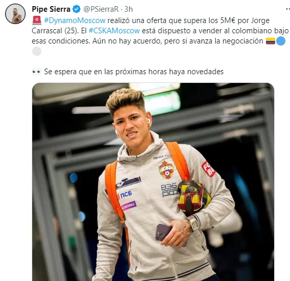 Según el periodista Pipe Sierra, Dynamo Moscú realizó una oferta de cinco millones de dólares por Carrascal y CSKA está conforme con los términos de las negociaciones, que no se han cerrado todavía pero que avanzan de manera favorable.