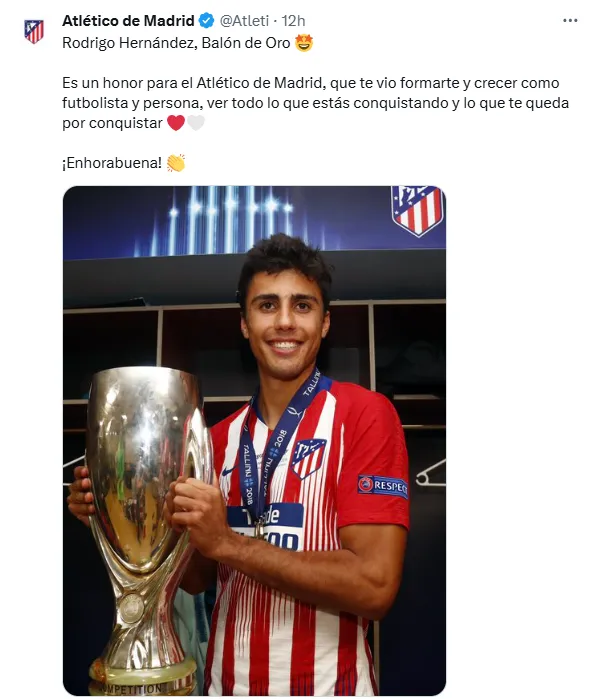”Rodrigo Hernández, Balón de Oro. Es un honor para el Atlético de Madrid, que te vio formarte y crecer como futbolista y persona, ver todo lo que estás conquistando y lo que te queda por conquistar. ¡Enhorabuena!”, escribió la institución rojiblanca en Twitter, con una imagen del futbolista con la Supercopa de Europa que ganó el conjunto del Cholo Simeone en 2018.