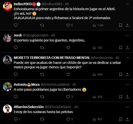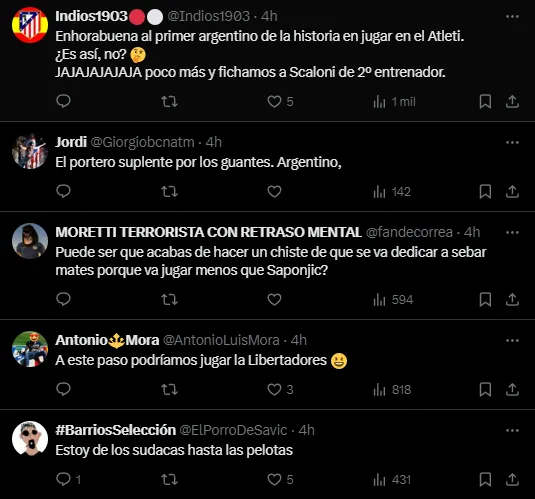 Como respuesta a los posteos que realizaron en X (ex Twitter) para presentar al arquero ex Udinese y Atalanta, varios fanáticos del Atleti comentaron fuertes palabras contra Argentina y los múltiples jugadores que se encuentran en el plantel actual. “A este paso podríamos jugar la Libertadores”, tomaron con humor algunos. Otros, fueron más agresivos: “Estoy de los sudacas hasta las pelotas”, expresaron como comentarios.