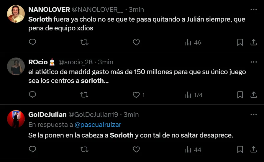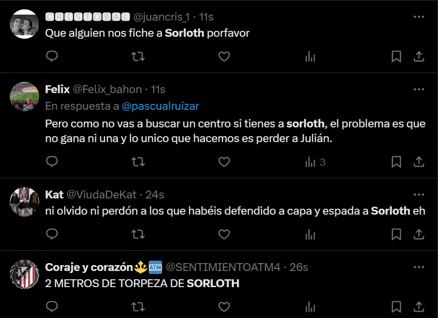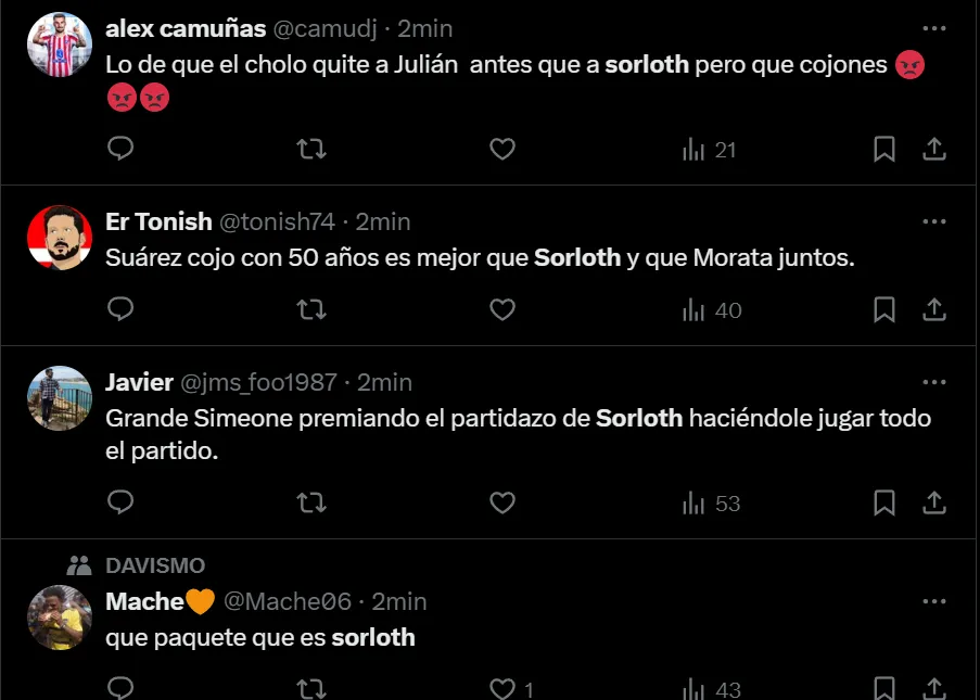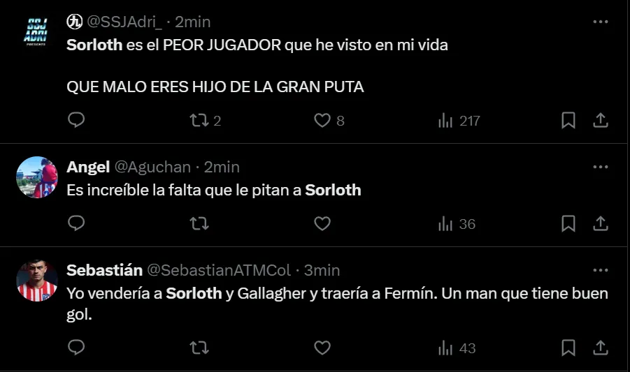“Que paquete que es Sorloth”, “Grande Simeone premiando el partidazo de Sorloth haciéndole jugar todo el partido”, “Suárez cojo con 50 años es mejor que Sorloth y que Morata juntos”, “Sorloth que anuncie su retirada según piten el final”, fueron algunos de los comentarios que realizaron los hinchas del Colchonero, quienes están muy molestos con el inicio de la temporada, donde registran dos empates y una derrota en tres presentaciones dentro del torneo español.
