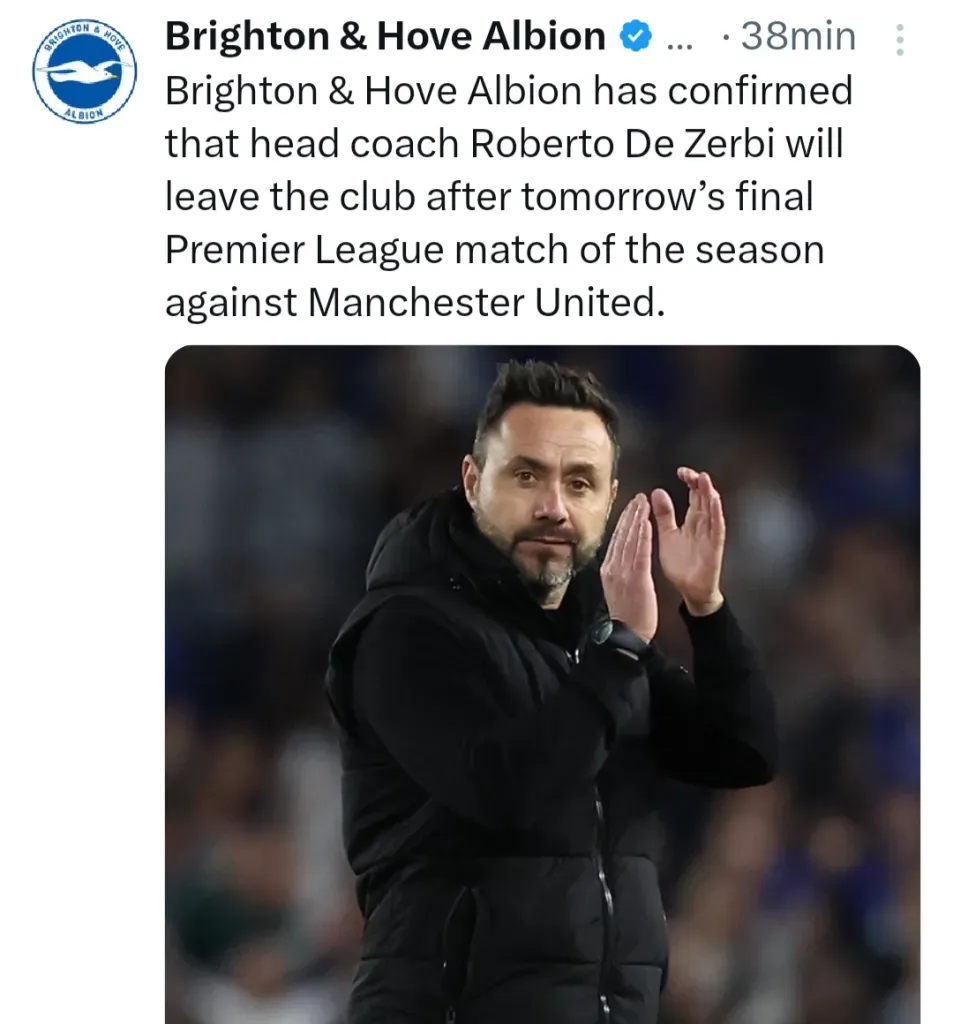 Brighton confirmó este sábado que Roberto De Zerbi dejará de ser el entrenador del primer equipo una vez que concluya el duelo ante Manchester United programado para este domingo, por la última jornada de la Premier League, poniendo fin así a un ciclo de dos temporadas en el cual consiguió una clasificación histórica a la Europa League.