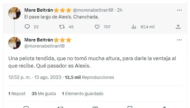 En su cuenta de Twitter, la reconocida periodista de ESPN, Morena Beltrán, fue reaccionando el partido en vivo junto a sus seguidores, y no pudo ocultar su admiración por la gran asistencia de Mac Allister a Salah: “El pase largo de Alexis. Chanchada”, tiró. Y agregó: “Una pelota tendida, que no tomó mucha altura, para darle la ventaja al que recibe. Qué pasador es Alexis”.