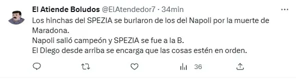 Con un 3-0 contundente por parte del campeón de la Serie A, la tribuna del Spezia no tuvo mejor idea que atacar al punto débil de los napolitanos: Diego Armando Maradona. Es por eso que, mofándose del fallecimiento de D10S, entonaron una versión similar al “Ho Visto Maradona” de Tifosis del Rey pero con una letra más que repudiable.