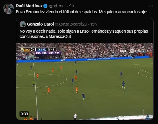 Ambos equipos europeos dispusieron de formaciones titulares y en Chelsea se vio un juego que, a la par de los resultados, sembró preocupación. En redes sociales, fueron varios los hinchas del cuadro londinense que manifestaron esta consternación, sobre todo en un posteo sobre una jugada puntual del partido contra Real Madrid.