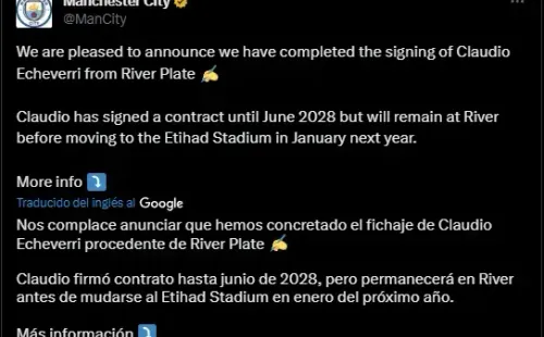 “River Plate y Manchester City llegaron a un acuerdo por la transferencia del futbolista Claudio Echeverri, quien seguirá vistiendo la camiseta de nuestro Club a lo largo del 2024 y luego continuará su carrera en el equipo inglés.