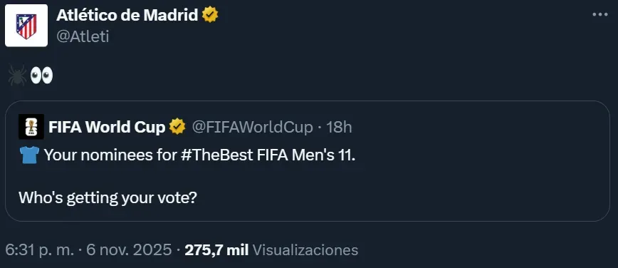 Más tarde, el club también se manifestó con cierta ironía en cuenta de Instagram con un mensaje en inglés que decía: “El mundo entero parece hacerse la misma pregunta”, que fue acompañado por la imagen de los delanteros nominados a quedarse con el premio The Best.