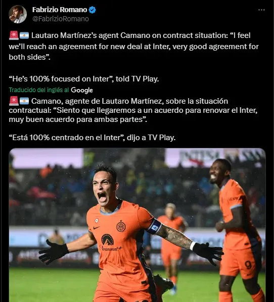 Conociéndose esta noticia sobre el interés serio de Al Ittihad buscando al campeón del mundo, este jueves rompió el silencio su representante, Alejandro Camaño, quien reveló la verdadera intención de Lautaro Martínez de cara a su futuro. En diálogo con TV Play, el agente del Toro comentó que él quiere seguir en el Inter y que incluso se encuentran en negociaciones por la renovación de su contrato: “Siento que llegaremos a un acuerdo para renovar el Inter, un muy buen acuerdo para ambas partes”. Además, señaló que Lautaro se encuentra “100% enfocado en el Inter”. Salvo un giro repentino en sus planes, Martínez seguirá en Milán por un largo tiempo.
