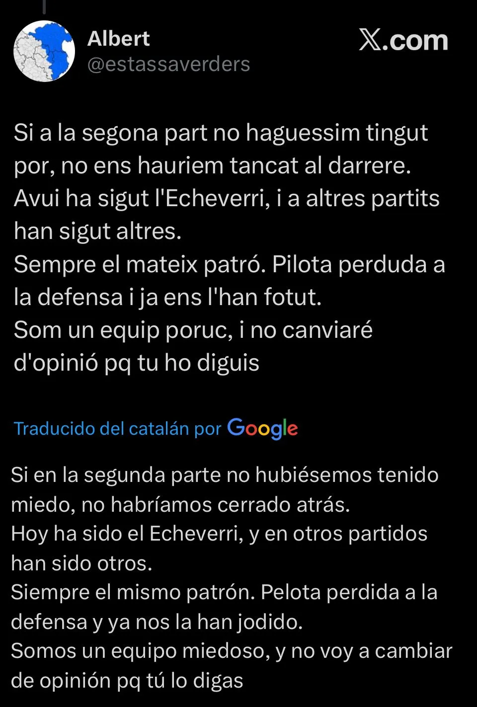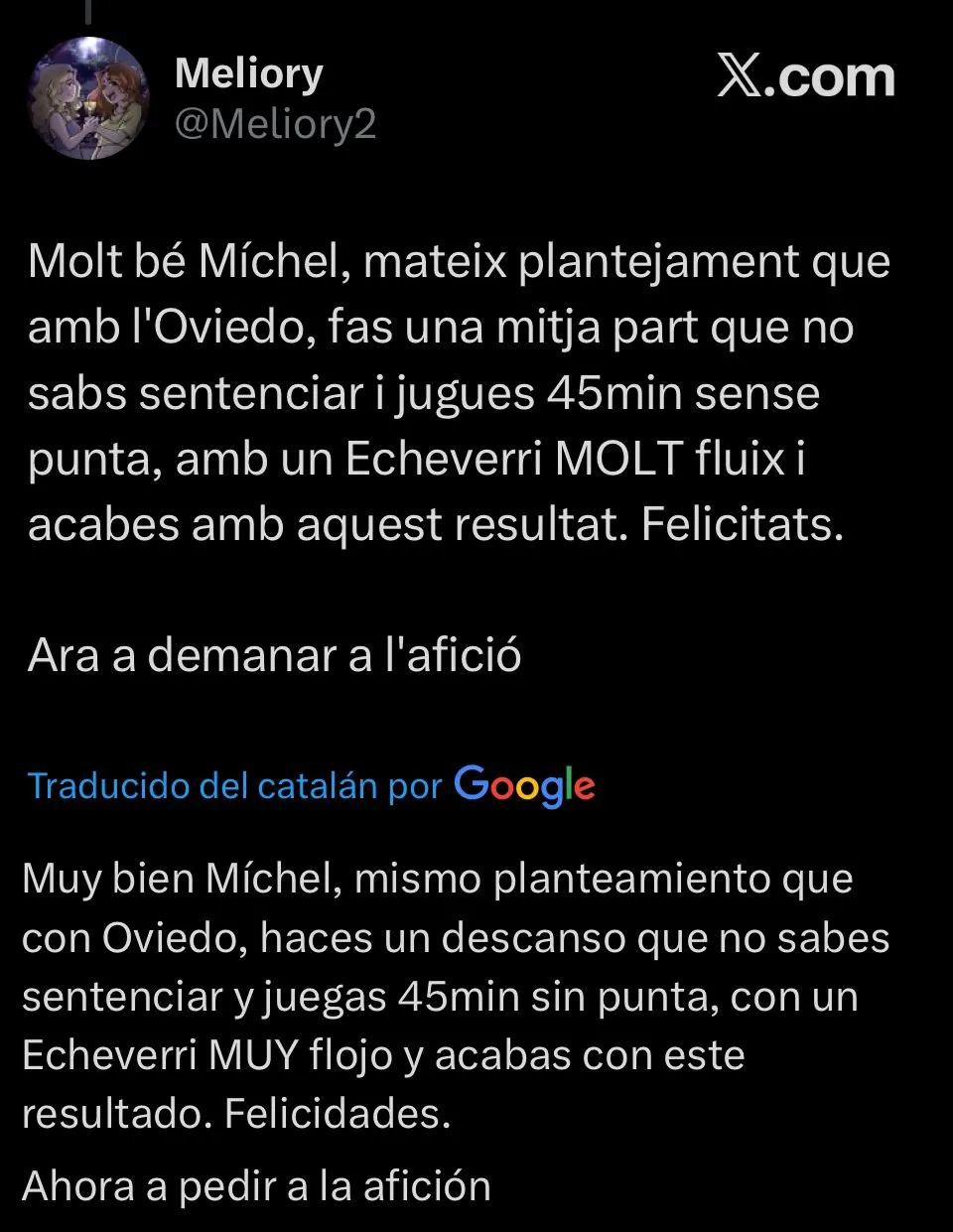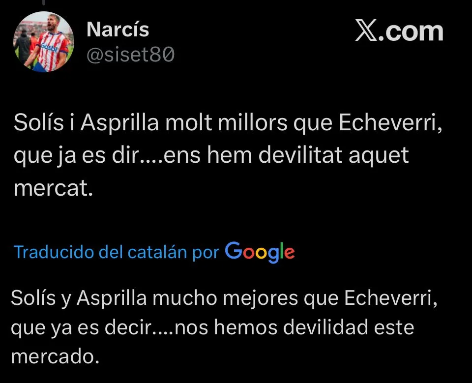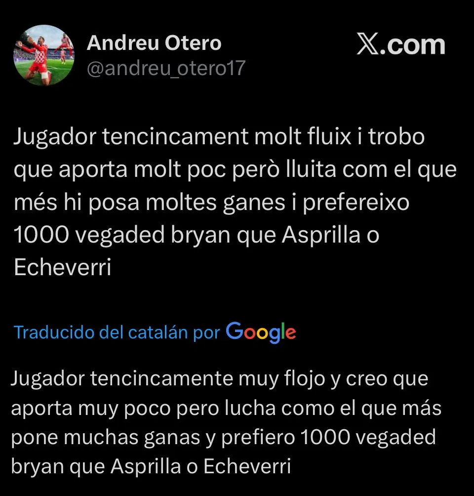 Con el empate consumado, y la bronca por el inesperado final del partido, la reacción de los hinchas del Girona en redes sociales fue tajante. Las críticas apuntaron con énfasis al rendimiento colectivo del equipo, aunque el Diablito no se vio excento en ciertos comentarios. “No sabe ni dónde juega“, escribió un usuario. Otro se mostró en la misma línea y agregó: “Espero que lo sienten en el banquillo“.