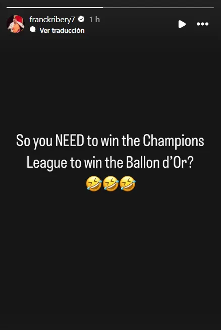 Ribery quedó tercero detrás de CR7 y Leo Messi en aquella edición en la que Ronaldo ganó su segundo Balón de Oro, y el bueno de Frank siempre sostuvo que el trofeo debía ser suyo. Tras las declaraciones del lusitano en las últimas horas, el talentoso extremo que se retiró en 2022 se expresó en una historia de Instagram. Irónicamente, soltó: “¿Entonces necesitás ganar la Champions para ser el Balón de Oro?“, junto con emojis de risa, siendo este un dardo directo al delantero de Al Nassr.