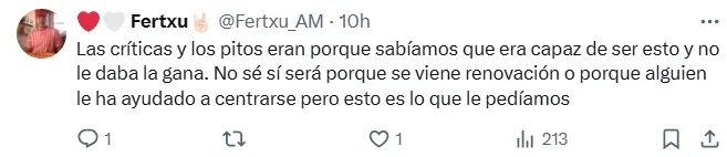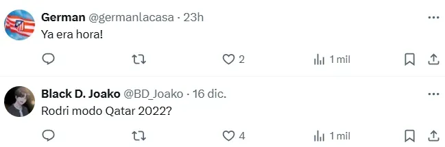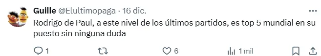 Los hinchas del Atlético de Madrid son los primeros en remarcar el crecimiento del argentino en los últimos encuentros, reconociendo que está en estado de gracia. “En modo Qatar 2022″, “ya era hora”, “siempre confié en este señor”, “top 5 en su puesto“, fueron algunos de los mensajes de los simpatizantes.