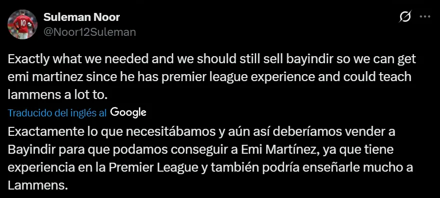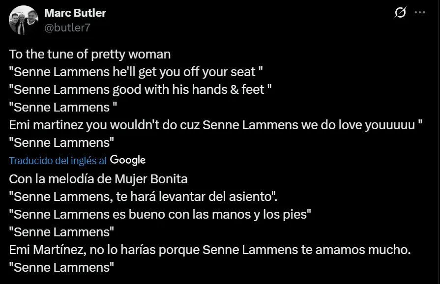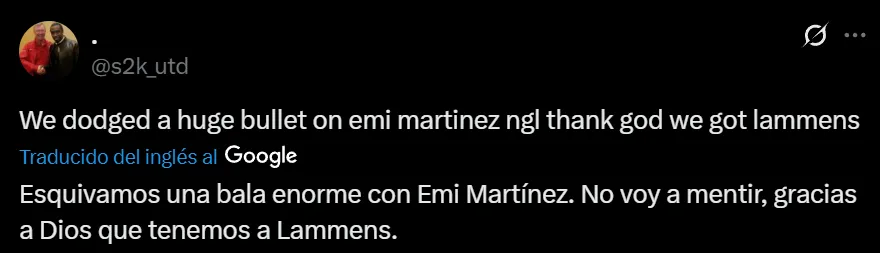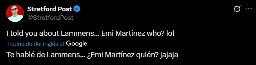 Otras frases que pudieron observarse en la antigua red social del pajarito, fueron igual de célebres por la presencia del nacido en Zottegem: “Esquivamos una bala enorme con Emi Martínez. No voy a mentir, gracias a Dios que tenemos a Lammens“; y “Te hablé de Lammens… ¿Quién es Emi Martínez?”.