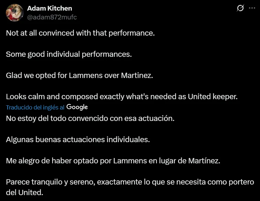 “No estoy del todo convencido con esa actuación. Algunas buenas actuaciones individuales. Me alegro de haber optado por Lammens en lugar de Martínez. Parece tranquilo y sereno, exactamente lo que se necesita como portero del United“, exclamó el usuario @adam872mufc por medio de Twitter. Pero no fue el único que se expresó.
