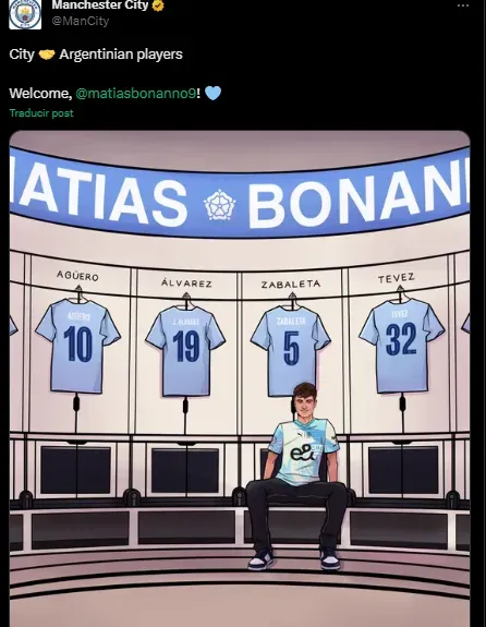 Con motivo de presentar un nuevo argentino en sus filas, el Manchester City quiso hacer un posteo dedicado a sus reconocidos futbolistas albicelestes, pero en el mismo, omitió nombrar a tres de ellos. Es que los Citizens sumaron a su escuadra de e-sports a Matías Bonnano, y para presentarlo, lo graficaron en un diseño junto a las camisetas de Julián Álvarez, Zabaleta, Tevez y el Kun Agüero, junto con un texto sutil que simbolizaba la unión del conjunto ciudadano con Argentina.