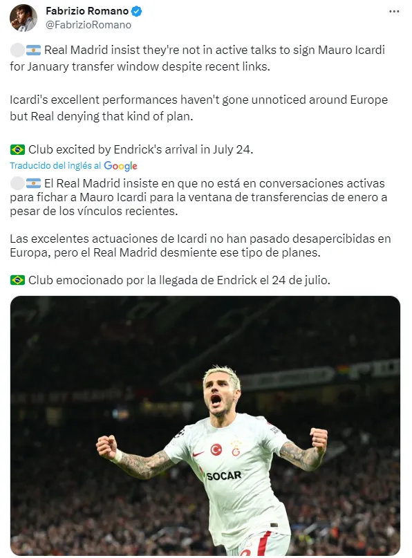 ”El Real Madrid insiste en que no está en conversaciones activas para fichar a Mauro Icardi para la ventana de transferencias de enero a pesar de los vínculos recientes. Las excelentes actuaciones de Icardi no han pasado desapercibidas en Europa, pero el Real Madrid desmiente ese tipo de planes”, reportó Fabrizio Romano en su cuenta de Twitter.