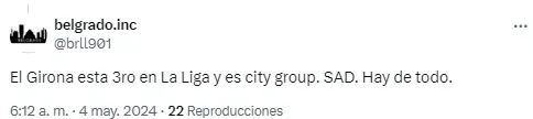 En redes sociales, los usuarios tomaron este ejemplo para manifestarse en contra de las SAD. “El lado oscuro del City Group y las Sociedades Anónimas Deportivas“, resumió uno de ellos. Otro, en cambio, usó a su favor la actualidad de uno de los equipos de LaLiga que pelearon por el título: “Girona es del City Group. Hay de todo“.