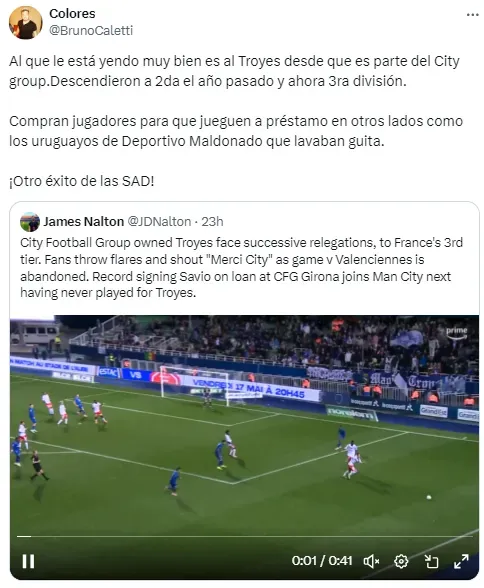 En Francia, Troyes, uno de los clubes del City Group, perdió la categoría por segunda ocasión consecutiva. De esta manera, en poco más de un año, pasó de la Ligue 1 al tercer escalón del fútbol del país europeo, en dónde competirá a partir del segundo semestre.
