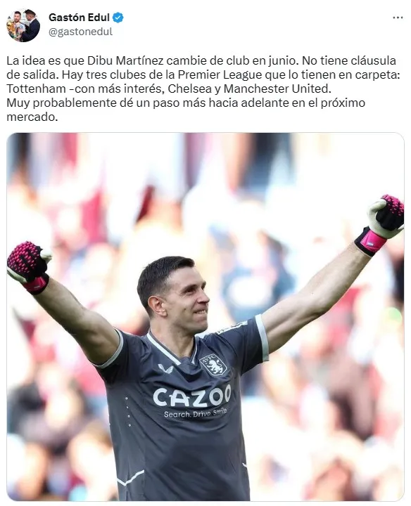 “Me gusta Old Trafford, es especial, tiene mucha historia”, había asegurado el mejor arquero del mundo, según la FIFA, cuando empezó a rumorearse su llegada a los Diablos Rojos. En fin, la lista de candidatos no parece salir de la Premier League y el futuro de Dibu es una incógnita, con la única certeza de que no seguirá en Aston Villa.