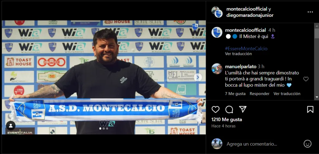Es que, este lunes, el hijo del legendario Diego Armando Maradona fue confirmado como el nuevo director técnico del Club Montecalcio de la quinta división de su país de origen. Inclusive, dicha institución ya presentó al también hijo de Cristiana Sinagra por intermedio de una publicación a través de las redes sociales.