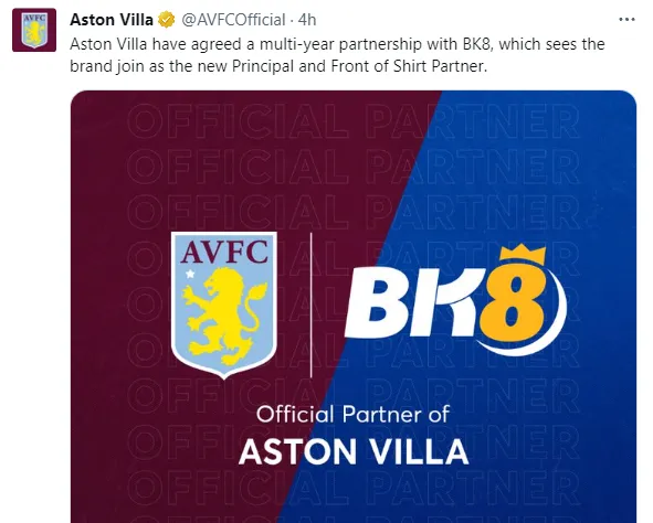 “Aston Villa ha acordado una asociación de varios años con BK8, en la que la marca se unirá como el nuevo socio principal y frente de camiseta”, se leyó en las redes sociales del club. El anuncio, sin embargo, no tardó en generar polémica y controversia entre los hinchas.