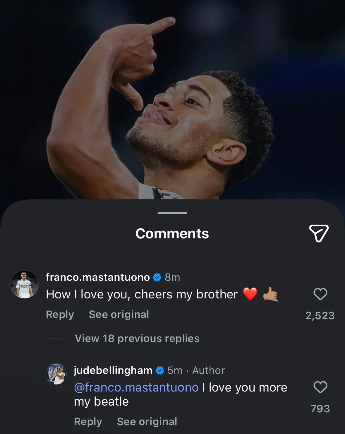 Este gesto del británico marca su apoyo hacia el futbolista de 18 años, pero su relación también tiene lugar fuera de la cancha. Es que ambos se dedicaron historias juntos tras la goleada ante Mónaco y allí se reveló un particular apodo de Bellingham hacia Mastantuono.