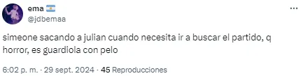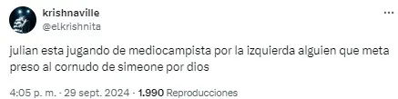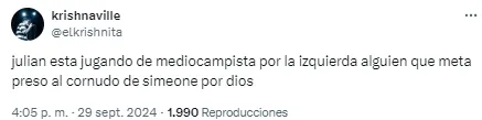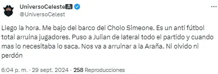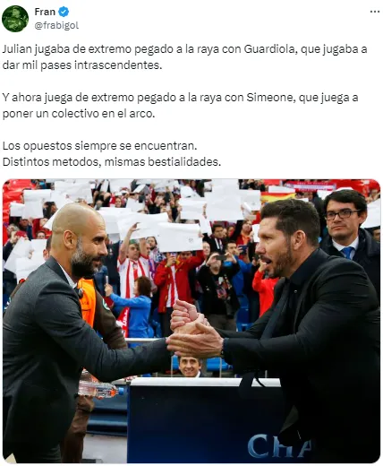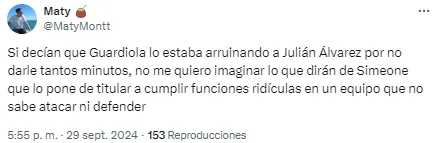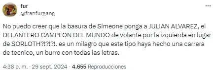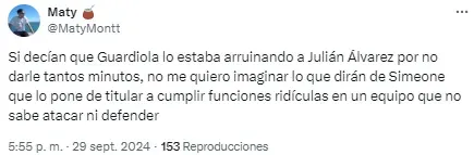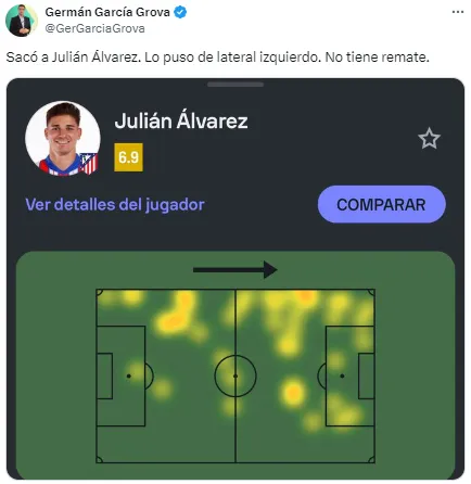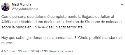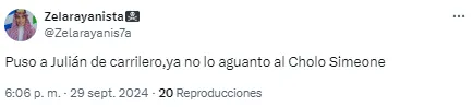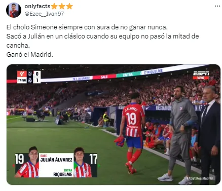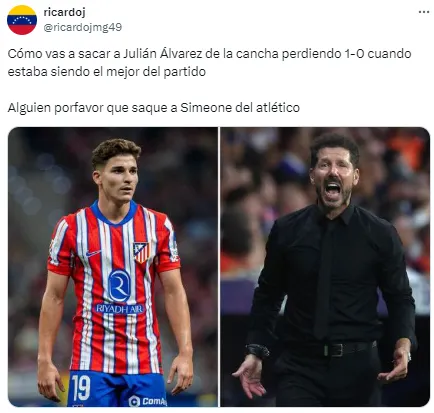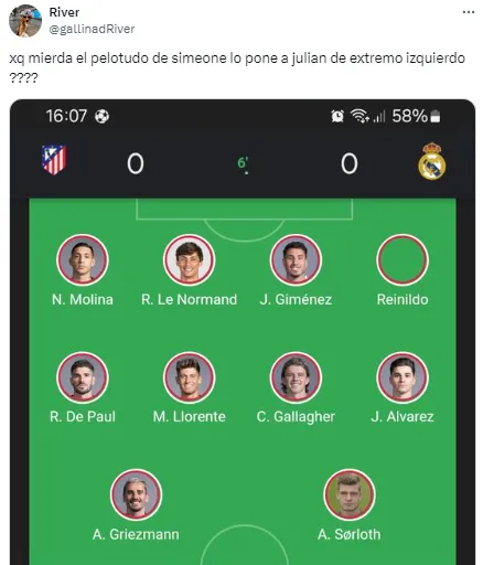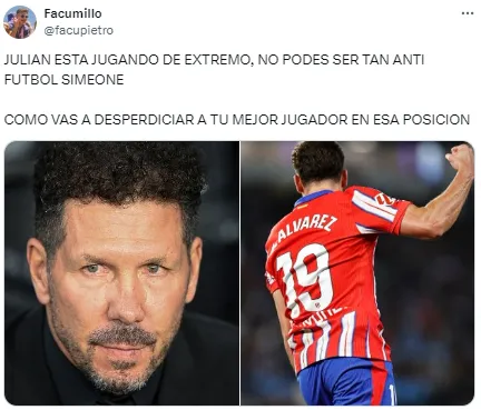 En redes no tardaron en notarlo y cruzaron a Simeone por su decisión. “Julián está jugando de extremo, no podés ser tan anti fútbol Simeone. ¿Cómo vas a desperdiciar a tu mejor jugador en esa posición?”, soltó uno de los usuarios. Otro, en cambio, disparó: “Llegó la hora. Me bajo del barco del Cholo Simeone”.