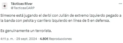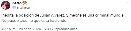 Aunque el partido contó con gran polémica por las agresiones a Thibaut Courtois desde la tribuna y la suspensión parcial del mismo, en redes sociales llamó particularmente la atención la posición en la que jugó Julián Álvarez este clásico.