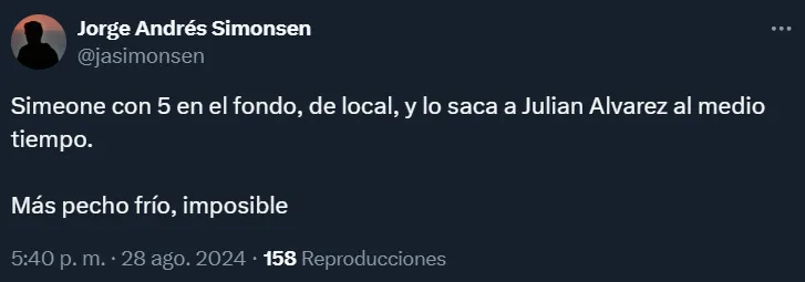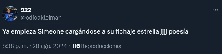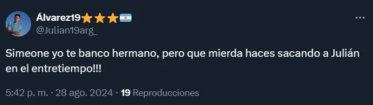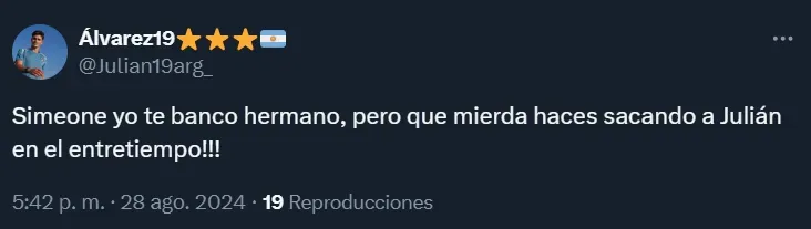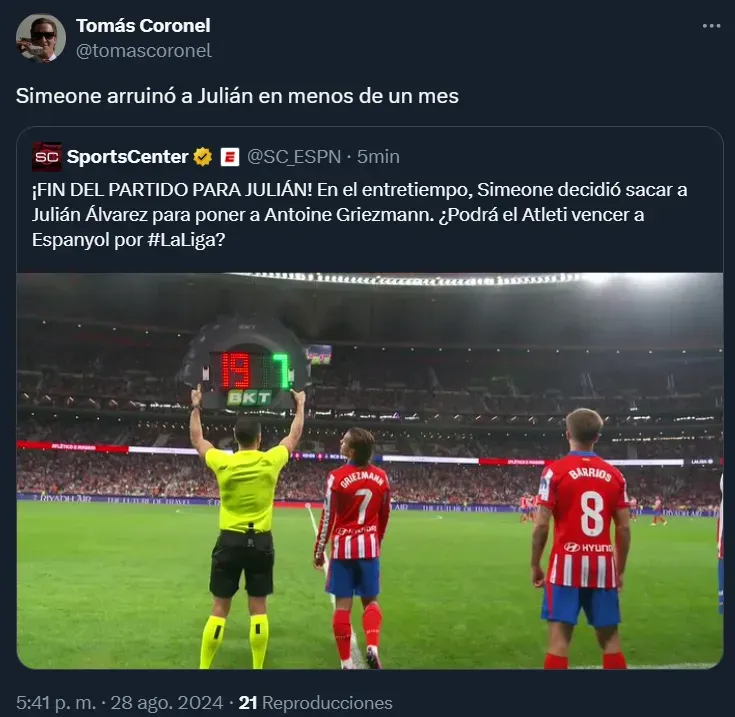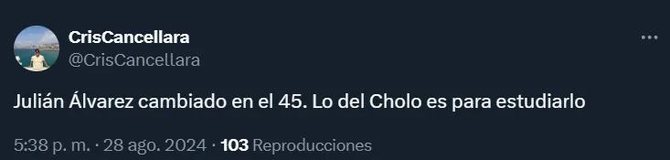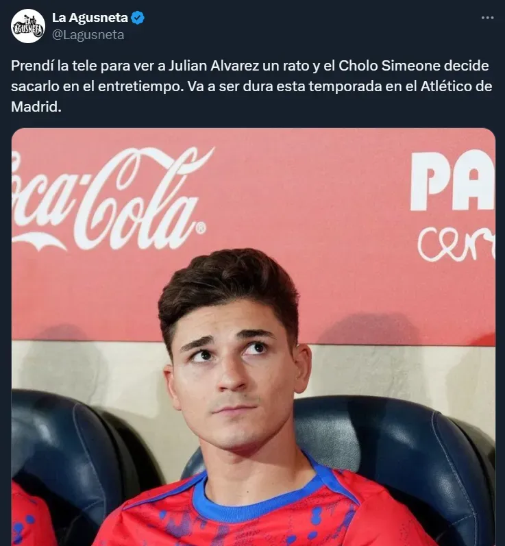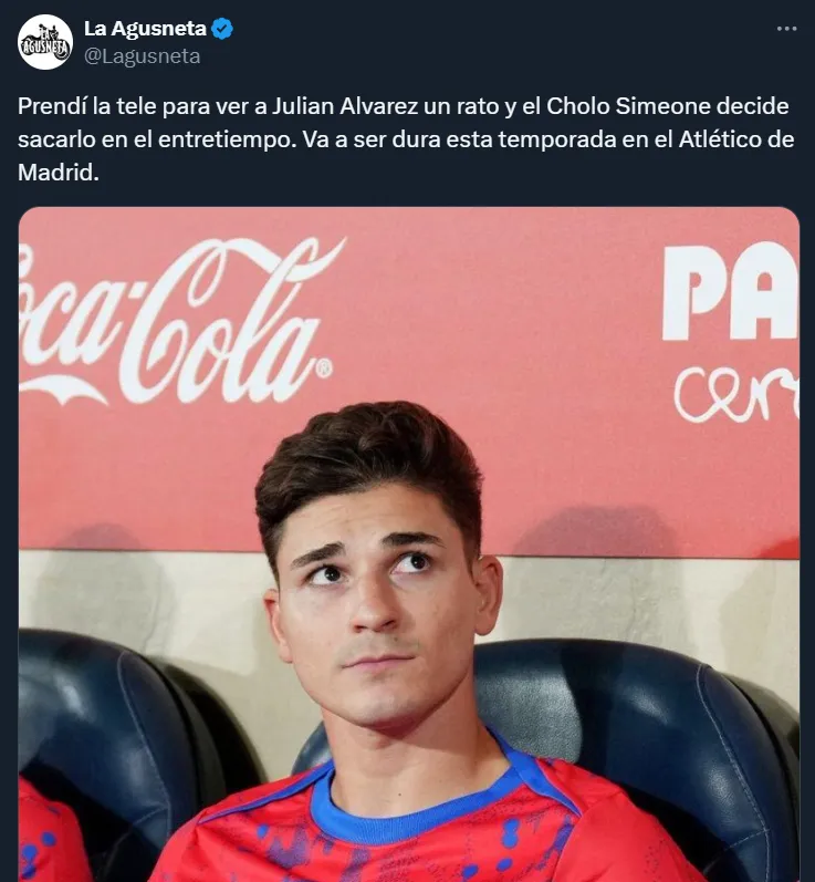 Sucede que el Cholo apostó por reemplazar a Julián Álvarez en el entretiempo del partido ante los recientemente ascendidos desde la segunda categoría del fútbol español. Esto, como no podía ser de otra manera, generó muchas reacciones en las redes sociales.