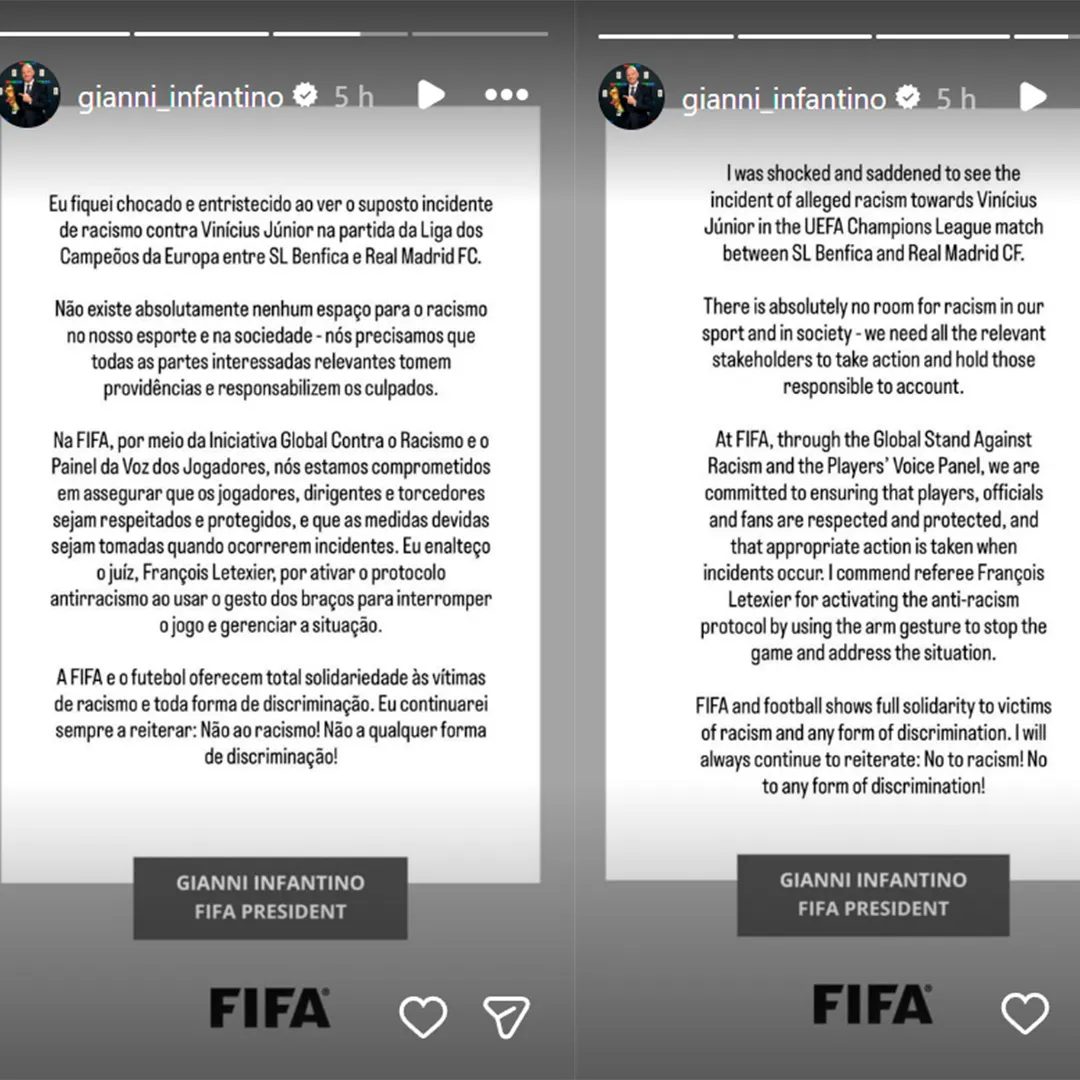 Por medio de las redes sociales, Infantino hizo una publicación a modo de comunicado, donde criticó la actitud del futbolista argentino: “Me quedé en shock y entristecido al ver el incidente de presunto racismo hacia Vinicius Júnior en el partido de Liga de Campeones entre Benfica y Real Madrid”, esbozó.