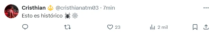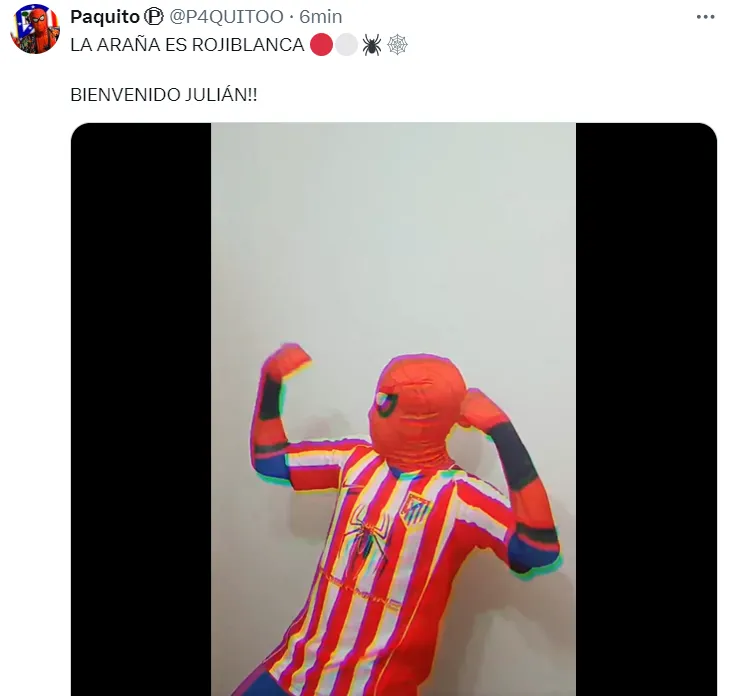 En horas de la mañana de Argentina -la tarde en España- el CM de Atlético de Madrid realizó algunas publicaciones dando señales que se vendría la presentación oficial de Julián Álvarez. Primero compartió un meme, luego un video de una persona vestida del Hombre Araña con la camiseta del club y en los comentarios de esos posteos, los hinchas enloquecieron.