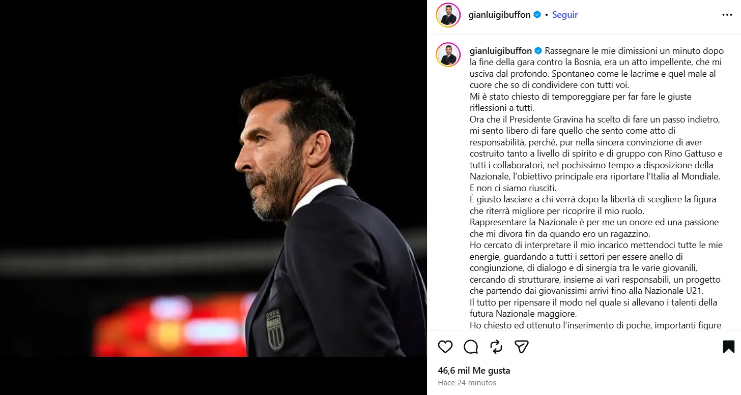 “Renunciar un minuto después de finalizar el partido contra Bosnia fue un acto urgente, que surgió de lo más profundo de mi ser. Tan espontáneo como las lágrimas y el dolor que siento, que sé que comparto con todos ustedes. Me pidieron que esperara hasta que todos tuvieran tiempo para reflexionar. Ahora que el presidente Gravina ha decidido dar un paso al costado, me siento libre para hacer lo que considero un acto responsable. Porque, a pesar de mi sincera convicción de que hemos construido mucho en términos de espíritu de equipo, junto con Rino Gattuso y todos nuestros colaboradores, en el poco tiempo disponible para la selección nacional, el objetivo principal era llevar a Italia de vuelta al Mundial. Y fracasamos“, escribió el legendario ex arquero en su cuenta de Instagram.