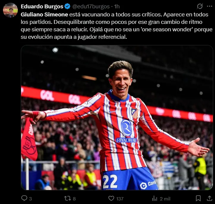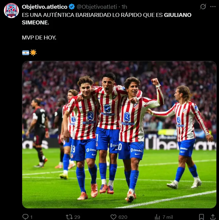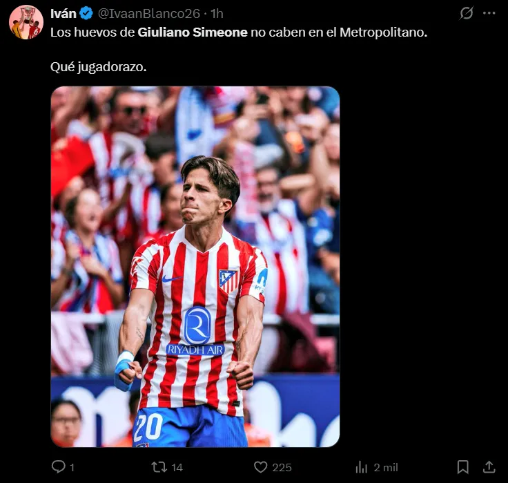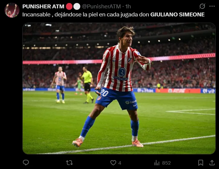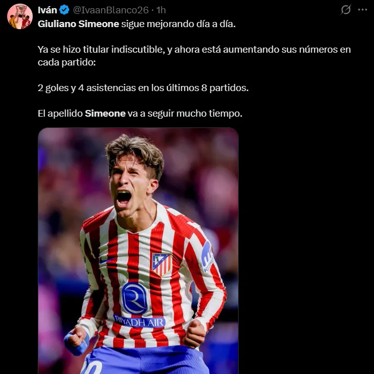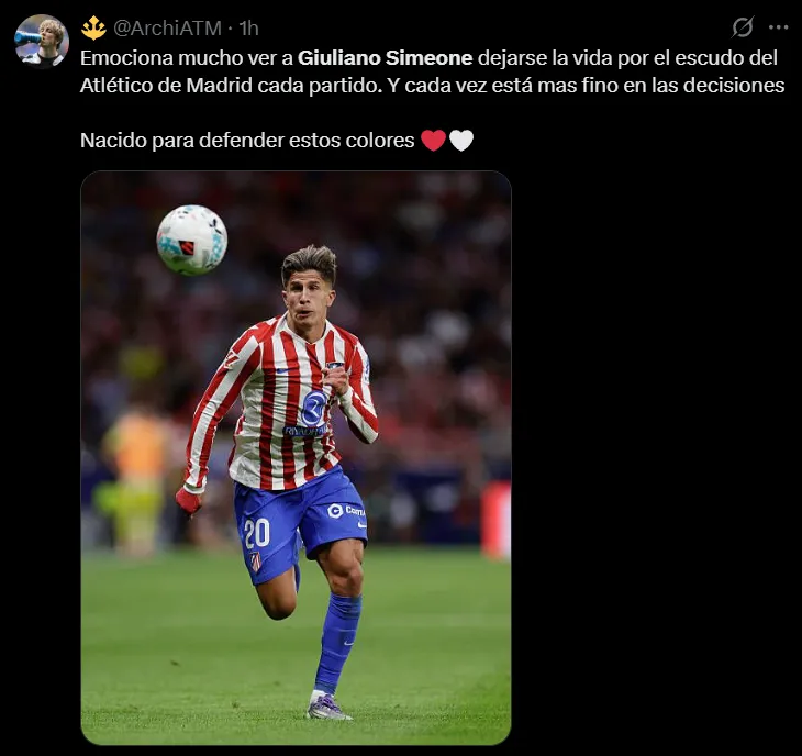 “Emociona mucho ver a Giuliano Simeone dejarse la vida por el escudo del Atlético de Madrid cada partido. Y cada vez está mas fino en las decisiones. Nacido para defender estos colores”, destacó uno de ellos. “Los huevos de Giuliano Simeone no caben en el Metropolitano. Qué jugadorazo”, resaltó otro. “Es una auténtica barbaridad lo rápido que es Giuliano Simeone. MVP de hoy”, lo elevó un tercero. “Giuliano Simeone sigue mejorando día a día. Ya se hizo titular indiscutible, y ahora está aumentando sus números en cada partido: 2 goles y 4 asistencias en los últimos 8. El apellido Simeone va a seguir mucho tiempo”, concluyó uno más.