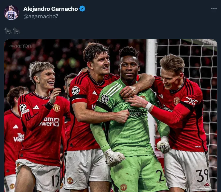 Durante las últimas horas, Garnacho realizó un llamativo e insólito posteo a través de su cuenta de Twitter, donde compartió una imagen junto a Harry Maguire, Scott McTominay y Onana, en la que se los observa celebrando la atajada del arquero camerunés. Pero lo que podría derivar en una sanción económica, además de que le impediría disputar partidos con los Red Devils sería los emojis que utilizó: dos orangutanes.