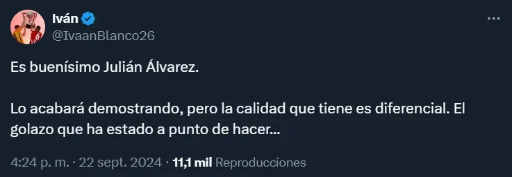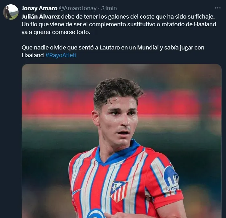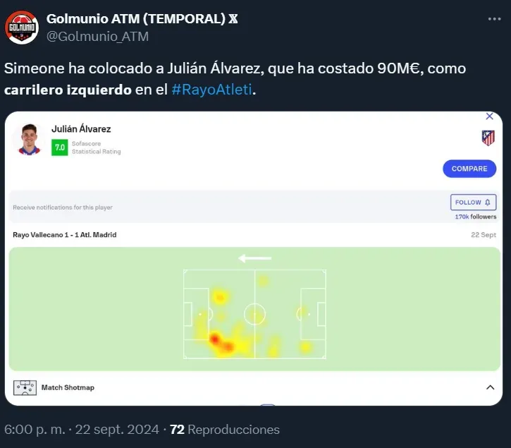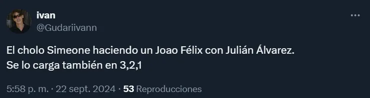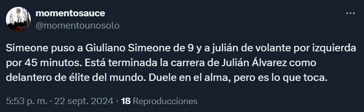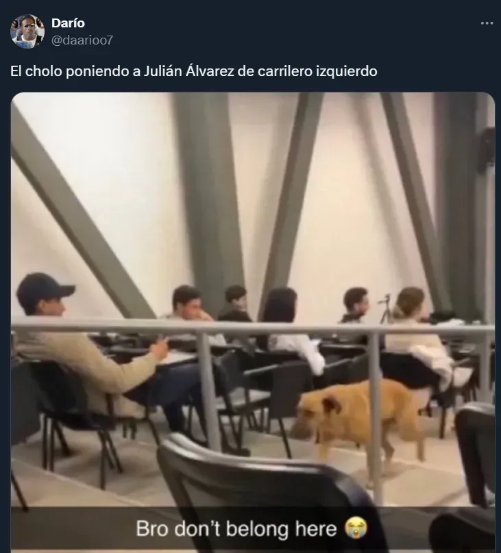 Por el contrario, por intermedio de las redes sociales, los fanáticos de la escuadra capitalina se enojaron con el propio Simeone por la posición en la que colocó a Julián Álvarez, lejos del área y recostado sobre la banda, incluso con responsabilidades defensivas.