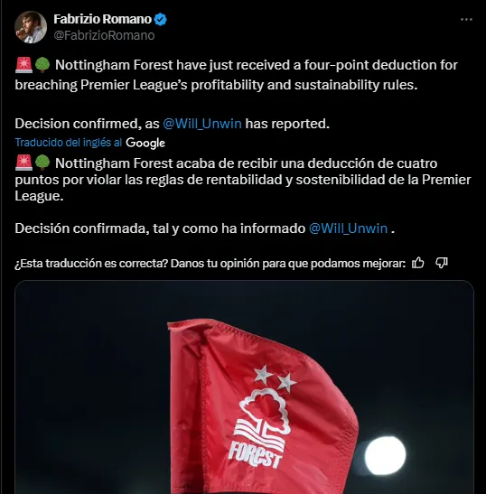 Al poseer pérdidas superiores a las permitidas por la Premier (la liga permite hasta 105 millones de euros en un lapso de 3 temporadas, y el Forest registra una pérdida de 125 millones) y las irregularidades presentadas en los mercados de fichajes, el periodista Will Unwin, de The Guardian, confirmó que los dirigidos por Nuno Spirito Santo sufrirán una quita de 4 puntos en la corriente temporada, algo que los dejaría posiciones en zona de descenso.